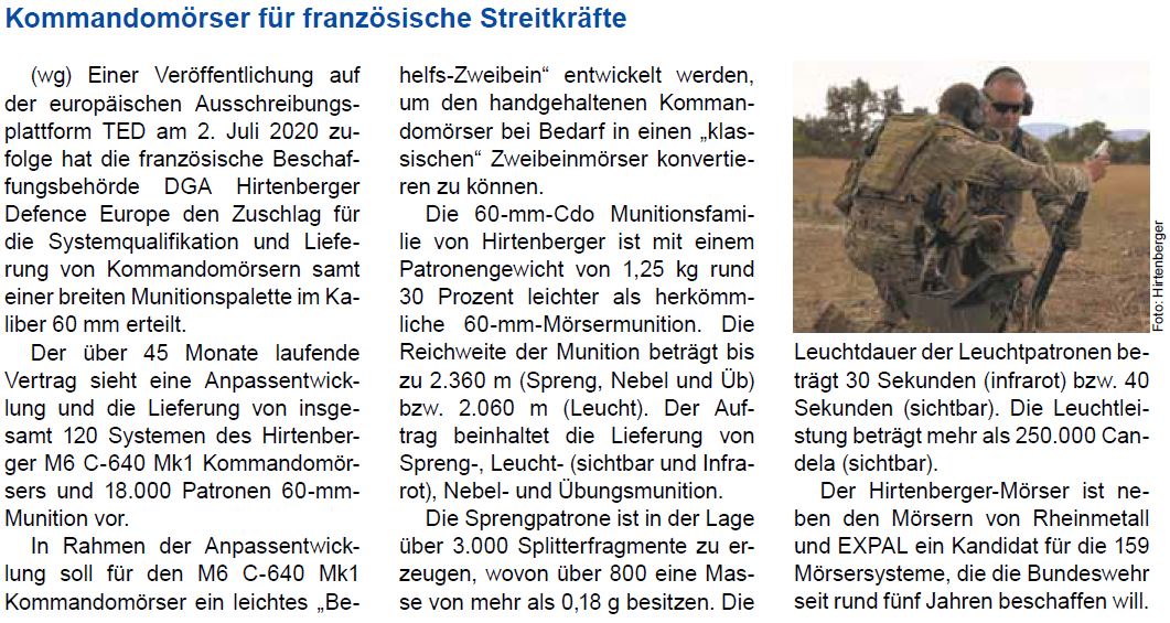 Die französische Beschaffungsbehörde DGA hat Hirtenberger Defence mit der Lieferung von Kommandomörsern sowie Munition im Kaliber 60 mm beauftragt.